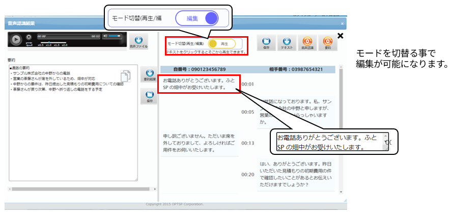 *オプション - 録音した音声ファイルを、音声認識エンジンでテキスト化し、閲覧参照及び編集をして結果をエクスポートすることができます。