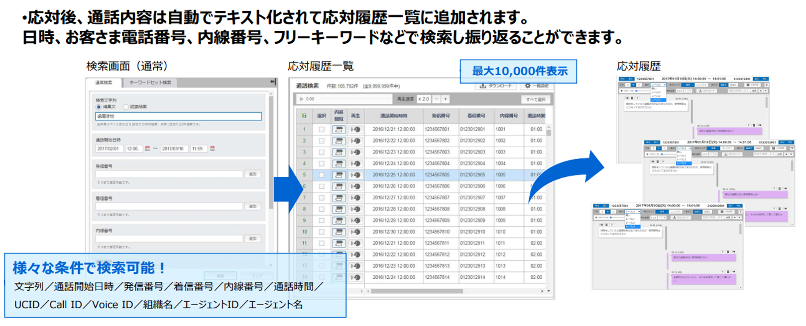 テキスト情報としては残したくない電話番号やクレジットカード情報などをシステム側で自動的にマスキングします。さらに追加で管理者画面で手動検索、マスキングも可能です。