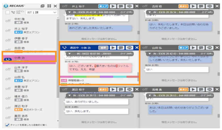 各オペレーターの電話対応状況をリアルタイムでモニタリングできます。リアルタイムで通話内容をテキストで確認できることにより、NGワードの検知、チャット機能でヘルプか可能です。