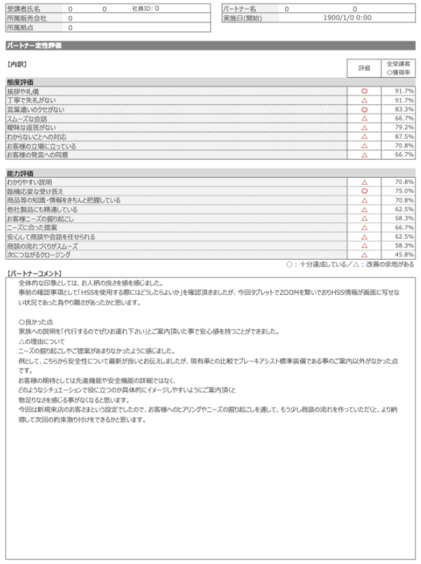定性・定量の的確なフィードバックが可能です。客観的な評価を受けることで、接客の傾向や自身の課題の把握ができます。