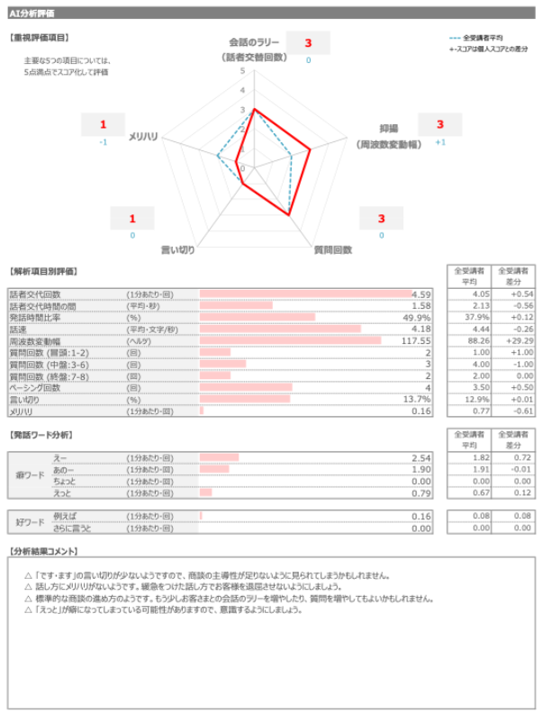 AIが話すスピードや抑揚、話者の交代回数などを数値化して記録します。また、口癖もキーフレーズ解析によって明らかになり、改善すべきポイントを可視化します。